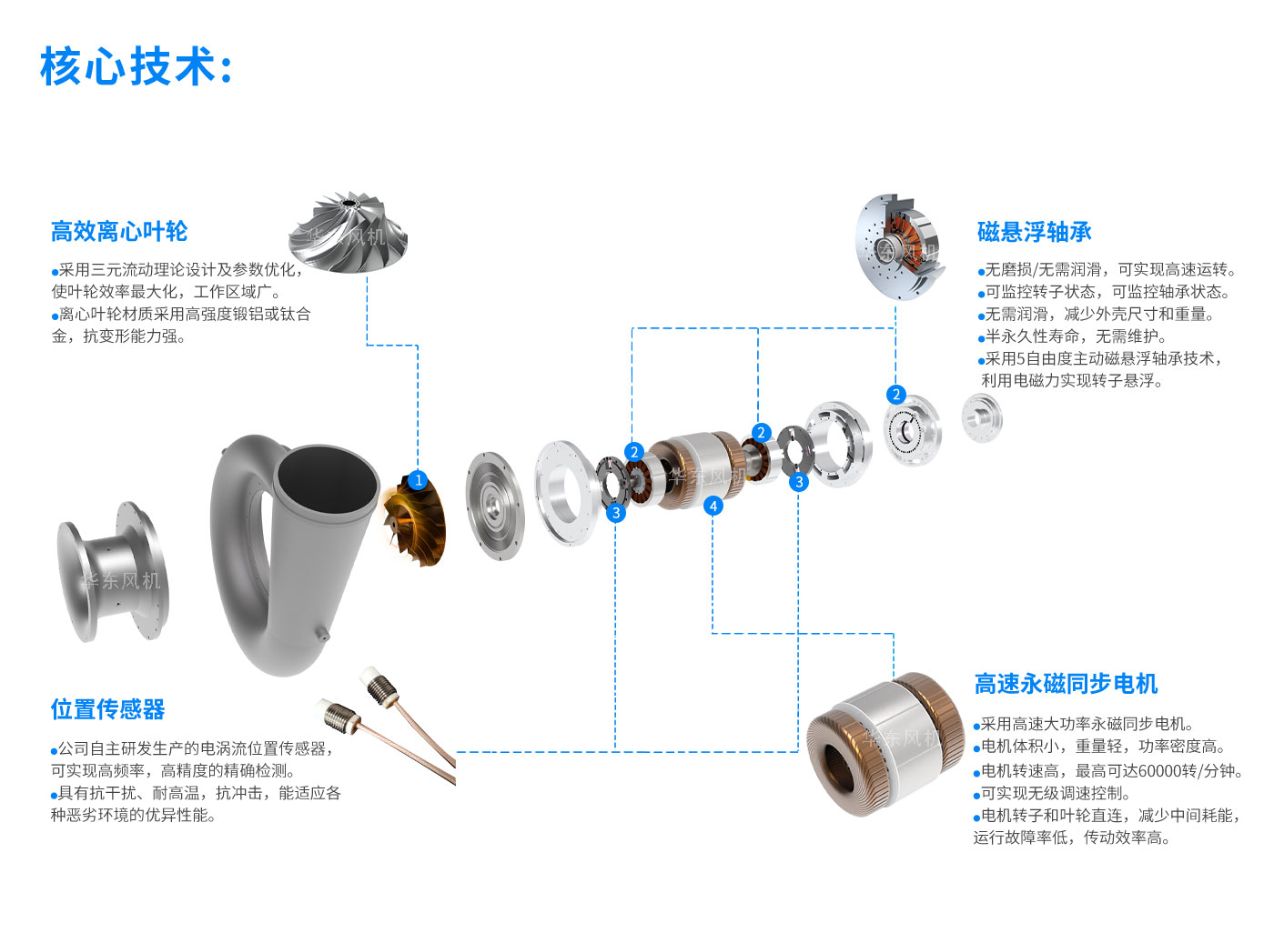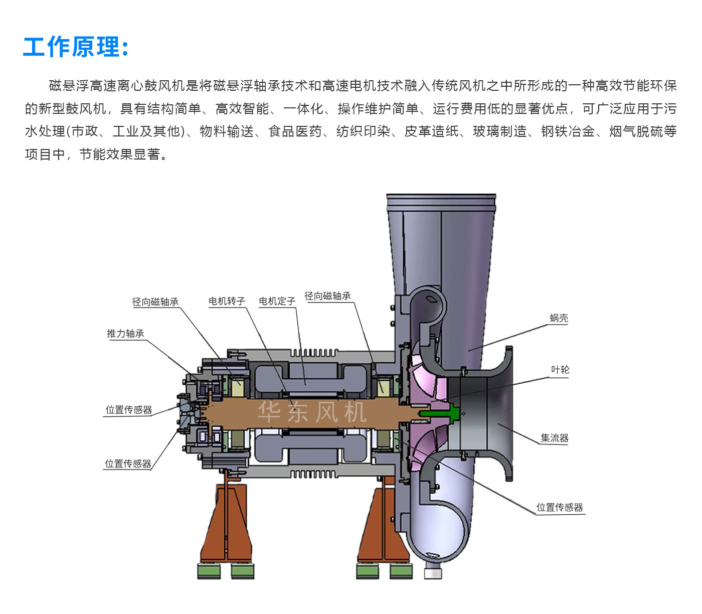 产品简介: 磁悬浮鼓风机是一款无接触无摩擦实现智能控制的高效节能环保产品,由五自由度磁悬浮轴承、大功率高效永磁同步电机、高效离心叶轮、高精度转子及高效专用变频器等核心部件组成!