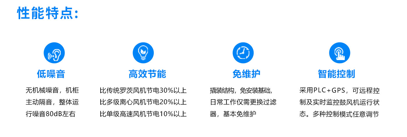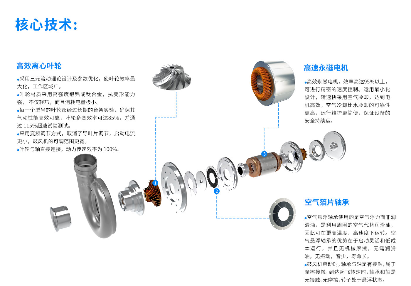 产品简介: 空气悬浮鼓风机的压力部分是由叶轮和卷轴构成,空气沿着叶轮的曲面从轴方向流入,加速后顺着半径方向流出后通过扩散器,依照断面的变化进行膨胀,使空气速度减慢,压力增加,进行空气输送的过程。空气悬浮离心鼓风机是一种高效节能环保的新型鼓风机,具有节能、低噪声、无油、运行可靠、操作维护简单和半永久性寿命等特点。