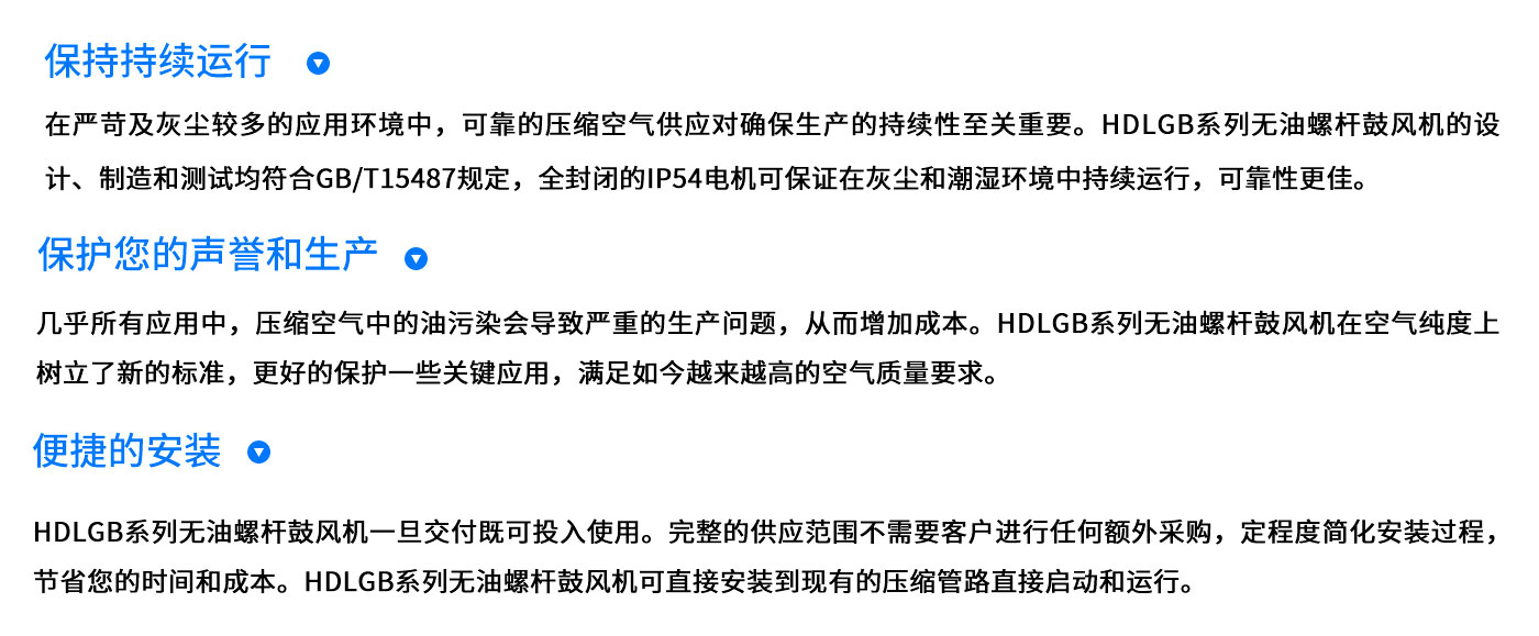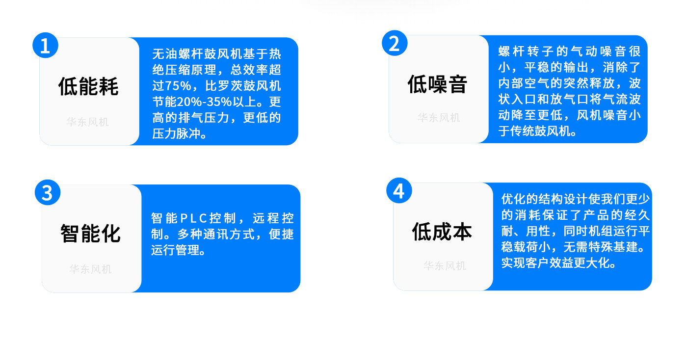 产品简介: 无油螺杆鼓风机可广泛运用于污水处理行业、水泥行业、化工行业、电力行业、钢铁行业、纺织行业、气力输送等各行各业,都是国民民生行业应用领域,市场运用面广,使用需求量大。 输送介质:空气、氮气、丁艺气等